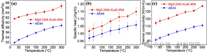 图10所示。(a)室温~ 300℃范围内Mg-3.2Al-4.4La-0.4Nd和AE44合金的热扩散系数,(b)比热和(c)导热系数。