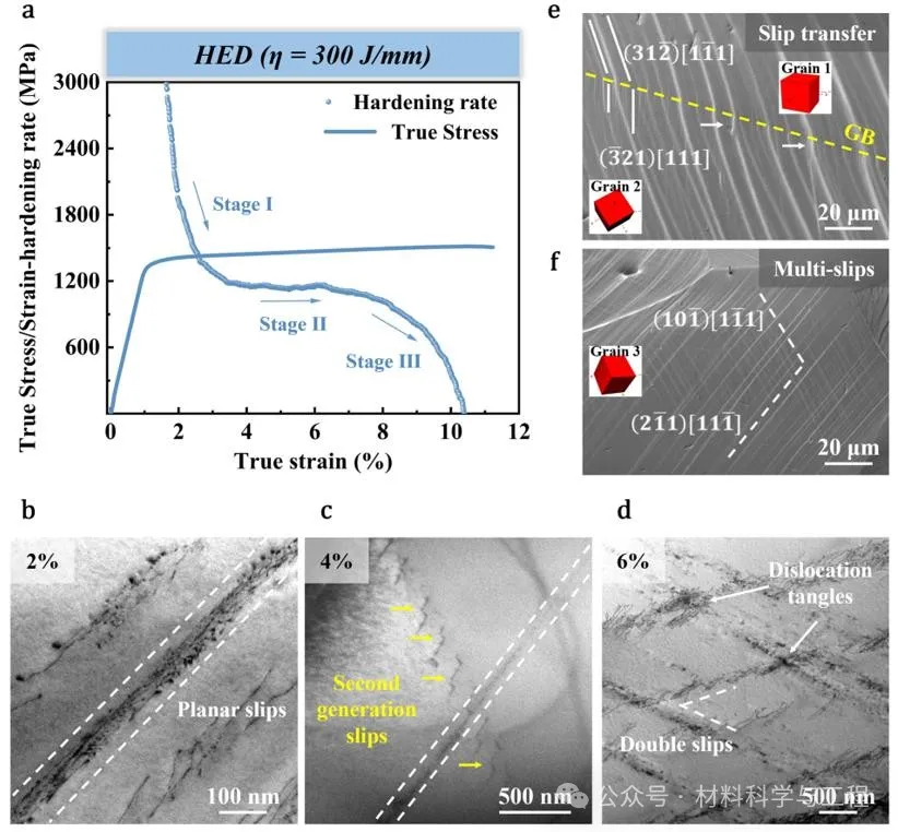 图4 增材制造TiVHfNbMo合金的加工硬化曲线与微观-纳观变形行为