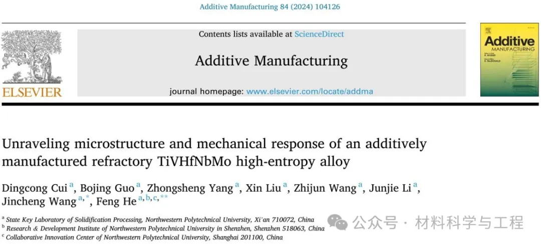 相关研究成果以“Unraveling microstructure and mechanical response of an additively manufactured refractory TiVHfNbMo high-entropy alloy”为题发表在增材制造领域顶刊《Additive Manufacturing》。论文第一作者为博士研究生崔丁聪,通讯作者为王锦程教授和何峰教授,通讯单位为西北工业大学。