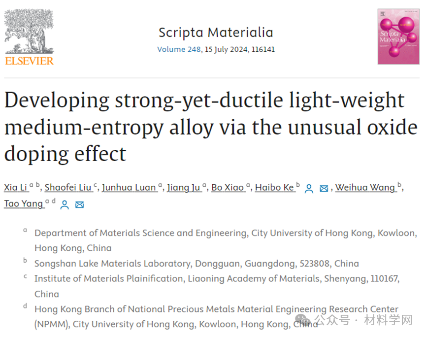 香港城大、松山湖材料实验室《Scripta Materialia》:基于非传统氧化物掺杂效应设计高强、高韧、轻质中高熵合金