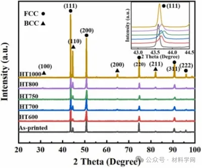 图3所示。退火样品的XRD谱图。所有退火样品均保持稳定的FCC和BCC双相结构。