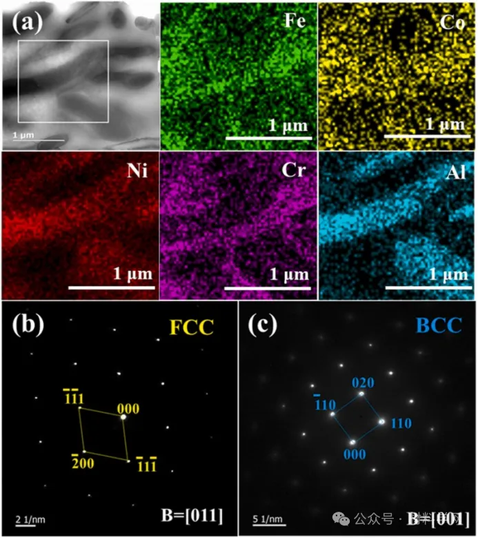 图7所示。HT1000样品的STEM分析。(a) STEM亮场图像和对应的STEM- eds图;(b)、(c) FCC和BCC相的SADP模式。