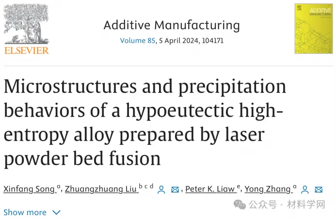 相关研究成果以“Microstructures and precipitation behaviors of a hypoeutectic high-entropy alloy prepared by laser powder bed fusion”发表在Additive Manufacturing上。
