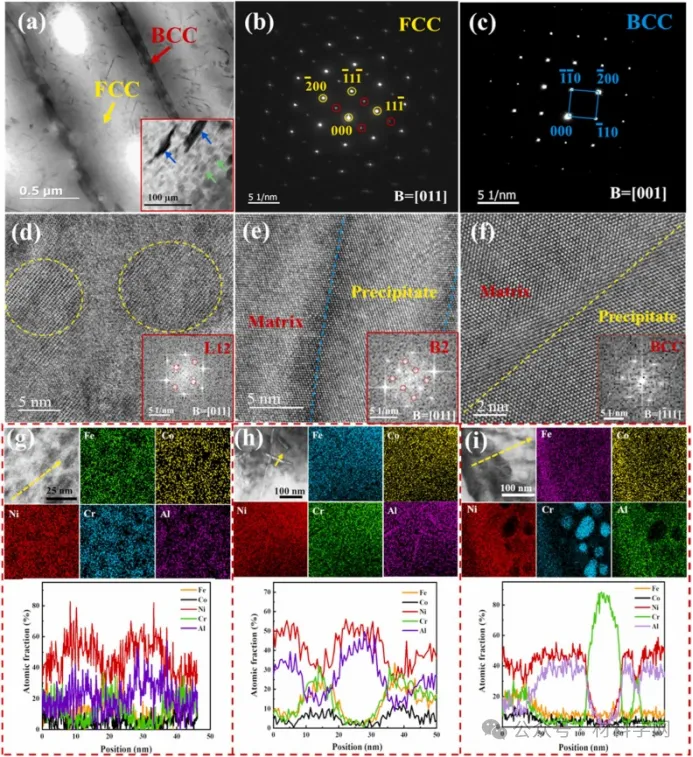 图6所示。HT750样品的STEM分析。(a) FCC + BCC双相结构的STEM亮场图像。插图为FCC相的高倍STEM图像,表明FCC基体中存在球形和针状两种析出物;(b)、(c) FCC和BCC基质的SADP模式;(d)-(f) HR-STEM图像,分别为球形和针状析出相与FCC基体的界面,富cr析出相与BCC基体的界面。插图分别为三种析出相对应的FFT图像;(g)-(h) FCC相的STEM-EDS图和一维浓度分布图(带虚线箭头),显示球形和针状析出物富含Ni和Al元素;(i) BCC相富cr析出物的STEM-EDS图和一维浓度分布(虚线箭头所示)。