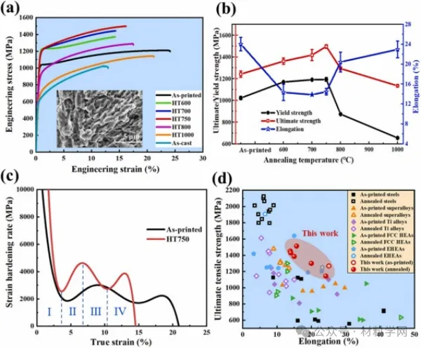 图9所示。打印和退火样品的拉伸性能。(a)工程应力-应变曲线。插图显示HT750试样的韧窝断口形貌;(b)极限/屈服强度和延伸值;(c)相应的应变硬化曲线;(d)与L-PBF制备的其他传统合金的力学性能比较,包括钢、IN718高温合金、钛合金、单相FCC HEAs、共晶HEAs。