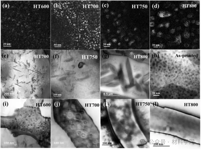 图8所示。不同退火温度下AlCo0.4CrFeNi2.7亚共晶HEA析出行为的演变(a)-(d) FCC (L12)相的STEM暗场图像;(e)-(g) FCC (B2)相的STEM亮场图像;(h)-(l) BCC(富cr)相的STEM亮场图像。(注:HT1000样本数据如图7所示)。