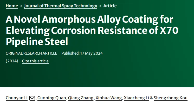 X70管线钢因其应用范围广,强度高、韧性好、可焊性好,是目前油气管道基础设施建设中使用的主流钢种。管线钢既可用于地下管道铺设,也能用于海洋环境。然而,这种复杂的环境使管线钢容易因腐蚀而失效。采用喷涂技术在材料表面制备非晶合金涂层是防止材料表面腐蚀的有效方法。 与传统的晶态金属相比,非晶合金具有高强度、高硬度、优异的耐磨及耐腐蚀性能等,其中Fe基非晶合金因其成本低而备受关注。将Fe基非晶粉末喷涂在管线钢表面,获得的Fe基非晶涂层可以对基体表面起到防腐耐磨的保护作用,能有效延长管线钢的使用寿命,并降低维护成本。 兰州理工大学材料科学与工程学院李春燕教授团队采用超音速火焰喷涂技术(HVOF)在X70管线钢焊接后的表面成功制备了新型的Fe-Ni-Cr-Co-Si-B-Nb非晶涂层,并对涂层的显微组织、力学性能和腐蚀行为进行了研究,以期提高X70管线钢的耐腐蚀性能。相关研究成果以于近期发表在Journal of Thermal Spray Technology期刊上。