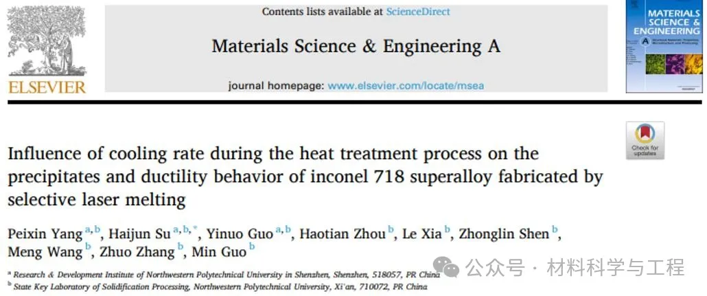 Peixin Yang, Haijun Su*, Yinuo Guo, Haotian Zhou, Le Xia, Zhonglin Shen, Meng Wang, Zhuo Zhang, Min Guo. Influence of cooling rate during the heat treatment process on the precipitates and ductility behavior of inconel 718 superalloy fabricated by selective laser melting. Materials Science and Engineering: A 902 (2024) 146603.