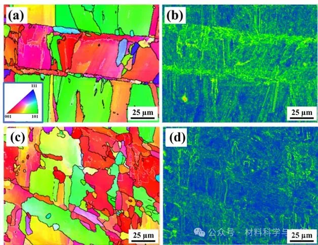 图2 不同状态下IN718高温合金横截面EBSD图: (a)和(b)沉积态; (c)和(d)HT-1
