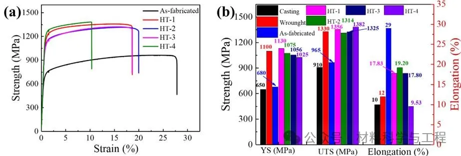 图4 (a)不同热处理条件下IN718室温应力-应变曲线和 (b) 拉伸性能对比图