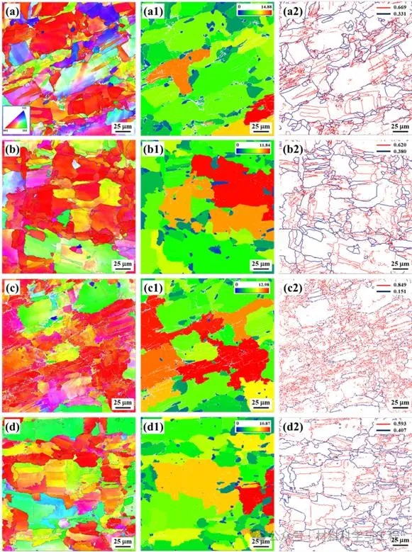 图6不同条件下IN718的反极图,晶粒取向分布图(1)和晶界图(2):(a) HT-1,(b) HT-2, (c) HT-3, (d) HT-4