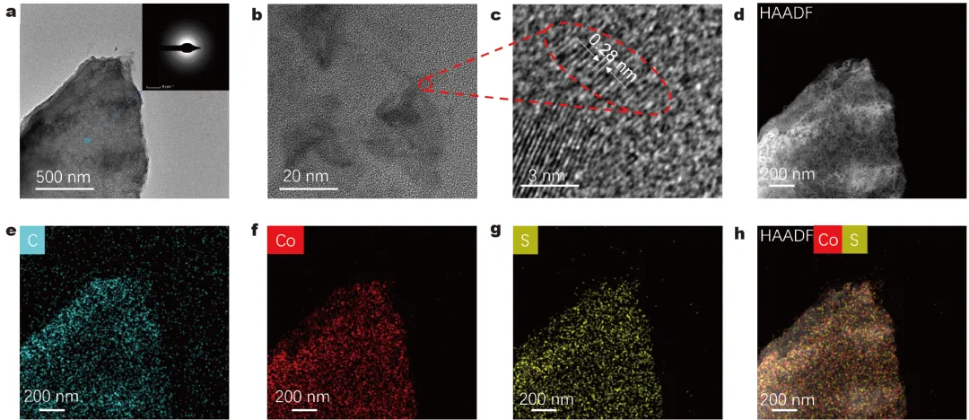 1) GDY/Co3S4/NF在10 mA cm−2电流密度下表现出223 mV的低过电位,在100 mA cm−2的大电流密度下,能够稳定电解45小时左右,该材料显示出了巨大的实际应用潜力。2) 由于GDY独特的炔键和大孔结构,它可以通过强电子相互作用与Co3S4相互作用,从而调节电子结构并提供有效的电荷转移通道,从而大大提高了其电催化OER的性能。Figure 1. The synthesis process of the material.Figure 2. (a) TEM images of GDY/Co3S4/NF, the inset is SAED pattern. (b, c) HRTEM images of GDY/Co3S4/NF. (d–h) EDS elemental mapping images of GDY/Co3S4/NF.Figure 3. (a) LSV diagrams of ZIF-67/NF, Co3S4/NF and GDY/Co3S4/NF. (b) Overpotential bar diagrams of three materials, left 10 mA cm−2, right 100 mA cm−2. (c) Tafel of three materials. (d) EIS maps of three materials. (e) Cdl diagrams of three materials. (f) Comparison of overpotential of GDY/Co3S4/NF with similar catalysts at a current density of 10 mA cm−2. (g) Constant current stability tests of GDY/Co3S4/NF and Co3S4/NF.Figure 4. Comparison of in situ ATR-SEIRAS measurements at different potentials of Co3S4/NF (left) and GDY/Co3S4/NF (right).