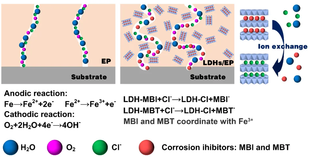 众所周知,海洋面积占地球的70.8%,大量的海洋船舶、海上平台、海洋管道、邻海设施长期浸没于海洋中。海洋环境具有高盐、富氧、温度高、波浪冲刷、海洋生物附着等特点,导致海洋装备中金属、钢筋混凝土等材料的严重腐蚀,这不仅带来了巨大的经济损失,还引发了恶劣的环境污染问题。 在金属材料的表面建立有机聚合物防腐涂层是相对经济高效的防腐手段。然而,防腐涂料在服役过程中不可避免地会出现内部缺陷或由外部冲击造成的局部损伤,腐蚀介质将沿涂层缺陷或破损到达基底金属表面,引起金属的局部腐蚀造成失效。因此,在受到破坏且腐蚀开始发生时,以非人为干预的方式实现自我修复,从而减弱基体腐蚀的智能防腐涂层正成为研究的热点。 海洋腐蚀介质中含有大量的Cl-、SO42-、Na+、Mg2+和Ca2+等离子,若腐蚀介质中的上述离子与涂层中无机载体材料接触后使后者发生刺激性响应并释放出缓蚀剂,则可实现涂层的自修复。近年来,镁铝层状双金属氢氧化物(LDH)因其片状阻隔作用被广泛应用于金属腐蚀防护领域。同时,负载阴离子缓蚀剂的LDH与腐蚀介质中的阴离子具有明确的离子交换能力。海洋环境中Cl-含量较高,基于负载有机缓蚀剂LDH的聚合物防腐涂层表现出Cl-刺激响应的巨大潜力,正受到海洋防腐自修复涂层研究者的高度关注。 基于上述背景,江苏科技大学材料科学与工程学院李照磊副教授课题组提出了一种新的解决方法和思路,通过煅烧再水合法制备了有机缓蚀剂MBI和MBT插层的镁铝水滑石(LDHs),再掺杂到环氧树脂(EP)共混,制备出了一种可通过离子刺激响应进行自修复且具有强抗腐蚀性能的复合涂层(图1)。 图2 EP,LDH-MBI/EP和LDH-MBT/EP涂层在不同浓度NaCl溶液中随着浸泡时间变化:(a) |Z|0.01 Hz (b) Rtotal和 (c) Cfilm 进一步地,课题组利用微区电化学测试技术验证了LDHs/EP复合涂层的自修复能力。如图3所示,在LEIS图像中表现出两边高中间低的“峡谷”形状,划痕处阻抗值随时间的变化直观反映出了金属的腐蚀情况和LDHs/EP涂层的自修复过程。这一结果证实,随着腐蚀介质的渗入,LDHs能够在有效地捕获Cl-的同时持续释放缓蚀剂MBI和MBT,有机缓蚀剂能够作用于涂层的划痕区域,并提高划痕区域的阻抗值。 最终,基于XPS等测试结果,课题组总结了LDHs/EP涂层的Cl-刺激响应自修复防腐机理,如图4所示。首先,LDH作为一种二维层状材料,增强了复合涂层对O2、H2O等腐蚀性物质的阻隔作用。其次,随着Cl-离子不断渗透到复合涂层中,通过Cl-离子的交换可以释放MBI或MBT缓蚀剂。随后,MBI或MBT缓蚀剂可以与暴露区域的Fe2+或Fe3+配位,有利于复合涂层在受损后表现出了海洋高盐含量腐蚀环境下优异的Cl-刺激响应主动防护特性。 图4 LDHs /EP涂层的防腐机理示意图 此项研究可为海洋等高盐严酷腐蚀环境中金属结构材料的防护提供重要的理论指导,所研发出的高分子复合涂层也具有突出的实用价值。
