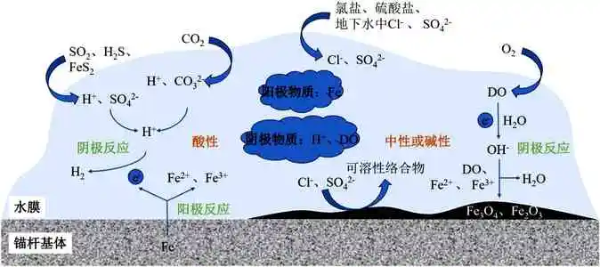 电化学腐蚀在锚杆腐蚀中普遍存在,其具备3个基本要素:金属、电解质、电子传递[33]。锚杆电化学腐蚀与矿井酸碱环境密切相关,其机理见图3。