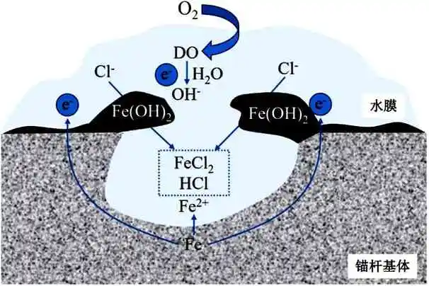 b.电化学腐蚀与矿井环境酸碱度密切相关,其在酸性环境中以析氢腐蚀形态存在,在中性或碱性环境中以吸氧腐蚀形态存在。点蚀形核生长与矿井环境中侵蚀性阴离子息息相关,侵蚀性阴离子可破坏锚杆氧化膜,诱导点蚀形核发展。应力腐蚀开裂与矿井围岩应力紧密相关,拉应力和腐蚀环境的耦合作用可诱发锚杆应力腐蚀开裂。