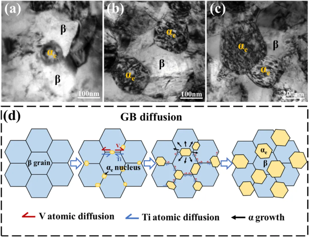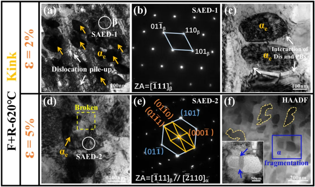 本研究提出了一种全新的高强钛合金组织-性能设计策略,通过“冷锻+冷轧”双联工艺引入纳米化扭折带,使其在后续时效处理中介入调控次生α析出尺寸和形貌,从而在扭折带内构筑超细等轴双相(α+ β)结构,同时在扭折带外形成多层级α析出相结构。这一独特的组织使得Ti-V简单二元钛合金强度达到1636 MPa并具有较好的塑韧性匹配,媲美复杂多元高强钛合金。这一成分“素化”的微结构设计策略为高性能钛合金研发提供了新的思路和方向。