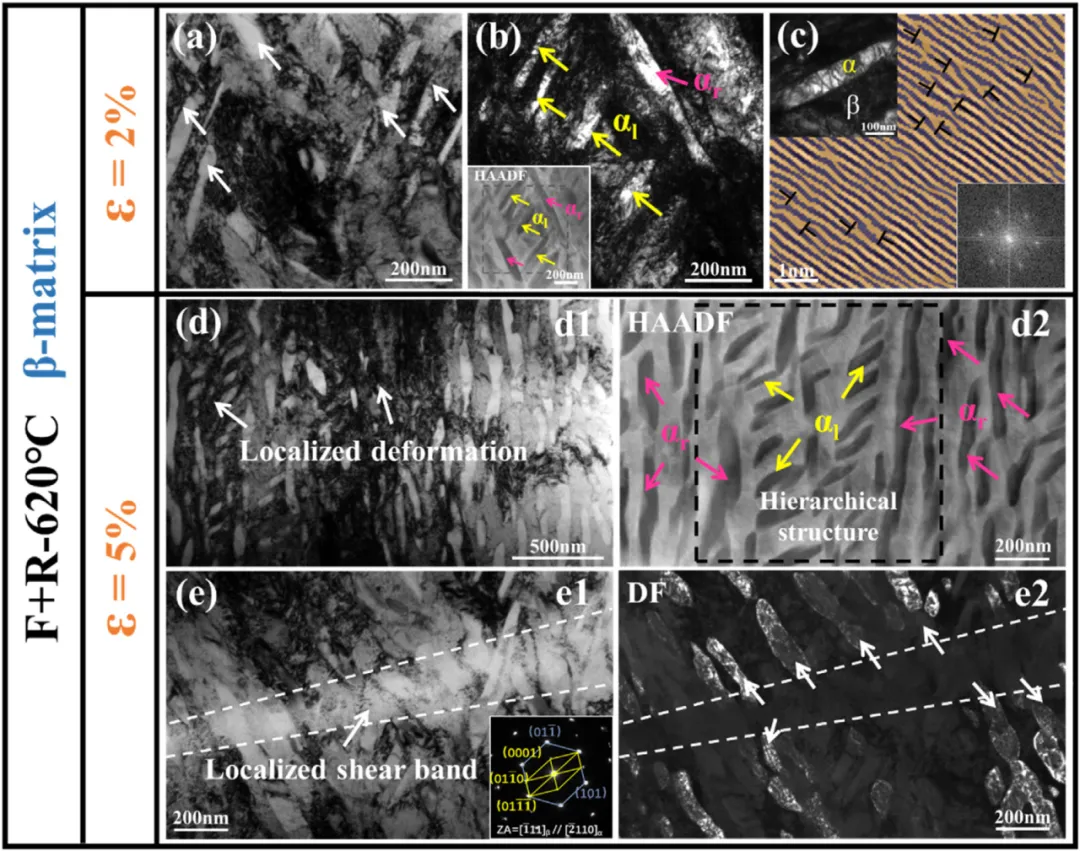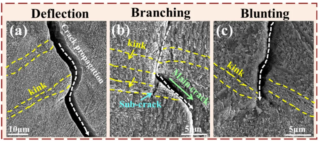 02 背景介绍 亚稳β钛合金由于具有高比强度、良好的淬透性、耐蚀性以及可热处理强化等性能优势,在航空航天、国防军工等领域获得广泛应用。其高强度主要通过时效过程中析出次生α相来实现,然而,合金提升强度的同时往往以牺牲塑韧性为代价,遵循着传统的强度-塑性倒置矛盾,极大地限制了这类合金高强性能的开发和应用。 03 本文亮点 我们创新性地设计了“冷锻+冷轧+时效”三联工艺(国家发明专利,授权号CN115786832B),通过“冷锻+冷轧”在Ti-V二元简单钛合金中引入纳米扭折带,进而借助时效形成多形态、跨尺度的次生α层级结构。这一独特的微观结构在变形时有效拦储位错、提升塑性应变配分、抵抗裂纹萌生扩展,实现了强度与塑韧性的同步提高。其获得的强度高达1636MPa,使得简单二元钛合金具有媲美多元高强钛合金的性能优势。这一结构设计为高性能钛合金研发加工提供了新的方向,其合金成分的“素化”可降低生产成本,有利于材料回收和资源再生利用。 04 图文解析 图2 Ti-11V合金试样的力学性能:(a)工程应力-应变曲线;(b)真应力-应变曲线和加工硬化率曲线;(c) Ti-11V合金与已报道的多元高强钛合金的σb vs. εf性能对比;(d)非线性弹性能释放率J(kJ∙m-2)随裂纹扩展a(mm)变化的R-曲线;(e) 该合金与多种多元钛合金的KJIC vs. σy性能对比。 图3 F+R-620°C合金样品变形前的微观组织:(a)晶内扭折带的EBSD-IPF图像。折线显示的是沿"A-B"线穿过扭折带的晶体取向差;(b)交替排列的时效扭折带和β-基体的SEM-BSE图像;(c)扭折带与β-基体构成的层状结构示意图;(d)扭折带的高倍BSE图像;(e)扭折带内的TEM形貌;(f)扭折带内的HAADF表征及EDS分析;(g)扭折带内αe-析出相的粒径统计;(h) β-基体的高倍BSE图像;(i) β-基体上的TEM形貌;(j) β-基体上的HAADF表征;(k) β-基体上多种形态析出相的尺寸统计。 图4 F+R-620°C样品拉伸后的显微组织:(a)、(b)、(c)和(d)分别对应于示意图中的区域'a','b','c'和'd'。图'a1'为β晶内的扭折形态。图'a2'是扭折带内的放大图像。图'b1'显示了β-基体上分布的变形带。图'b2'是变形带的放大图像。图'c1'是β晶粒在'c'区域的低倍放大。图'c2'是图'c1'中变形损伤扭折带的高倍图像。图'd1'显示了β晶内的整体形态。图'd2'是扭折带的高倍图像。 图5 F+R-620°C合金试样在不同塑性变形阶段β-基体的亚结构演变:(a) β-基体在ε = 2 %时的BF-TEM图像;(b) β-基体上的DF图像。插图显示相应的HAADF图像;(c)高分辨透射电子显微镜( HRTEM )图像,位错标记为'⊥';(d) β-基体在ε = 5 %时的BF-TEM图像。图'd1'显示了局部变形区域。图'd2'为非均匀塑性变形阶段层级结构的HAADF图像;(e)应变ε = 5 %时的局部剪切带图像。图'e1'显示了局部剪切带的BF-TEM图像。图'e2'显示了相应的DF-TEM图像。 图6 F+R-620°C合金试样在不同塑性变形阶段扭折带内的亚结构演化:(a)应变ε = 2 %时,扭折带内部的BF-TEM图像;(b)为图(a)中白色圆圈区域对应的SAED花样;(c)扭折带内等轴状αe-析出相的放大形貌;(d)应变ε = 5 %时,αe-析出相的BF-TEM图像;(e)为图(d)中白色圆圈区域对应的SAED花样;(f) αe-析出相在扭折带内部的HAADF图像。 图7 经过(a) 30 min,(b) 1 h和(c) 2 h不同时效时间,扭折带内超细(αe+β)双相结构的形成过程;(d)组织演化示意图。 图8 F+R-620°C合金试样中时效扭折带对裂纹扩展的阻碍作用:(a)裂纹偏转;(b)裂纹分叉;(c)裂纹终止。 05 总结与展望 05 作者介绍 06 引用本文 Keer Li, Wei Chen, Jinyu Zhang, Shewei Xin, Jun Sun, Making titanium alloys ultrahigh strength and toughness synergy through deformation kinks-mediated hierarchical α-precipitation, J. Mater. Sci. Technol. 207 (2025) 142-159.