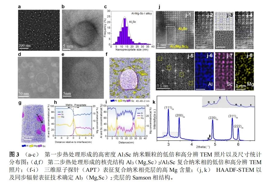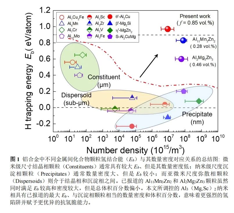 西安交通大学 金属材料强度全国重点实验室 刘刚教授和孙军院士团队 面向重大应用需求 创制出新型抗氢脆铝合金 研究结果以“基于结构复杂相工程化设计创制抗氢脆铝合金”(Structurally complex phase engineering enables hydrogen-tolerant Al alloys)为题在线发表在《自然》(Nature)期刊上。 这是团队继耐高温铝合金之后,又一类面向重大应用需求,开发的新型铝合金材料,将积极开展大吨位中试实验,以早日实现工程化应用。 研究背景 “双碳”战略下“氢能经济”是未来社会发展的重要推动力,其中氢的存储与运输对结构金属材料的服役性能提出了更高要求。 铝合金具有轻质、高比强、低温性能优异等众多优点,是轻量化发展的首选金属材料,也是“氢能经济”的重要候选材料。但是铝合金与高强钢、钛合金等其他金属材料类似,表现出明显的“氢脆”敏感性,即在吸收氢原子后其变形能力下降、塑性降低,极易引起低应力脆断和无征兆失效。例如传统的高强铝合金材料在仅仅1~3 ppmw(ppmw:百万分子一重量比)充氢量下,拉伸延伸率与未充氢相比降低幅度超过50%。 氢脆这一号称“金属界瘟神”的、服役环境导致的性能退化行为,严重制约了铝合金在“氢能经济”以及潮湿服役场景下的广泛应用。 经过多年的深入研究,已经提出了多个氢脆的机制模型,也发展了一些抑制氢脆的微观组织设计方法。特别得益于近年来迅速发展的三维原子探针技术在原子层级上的精准定量表征,研究者们逐渐意识到:调控金属间化合物第二相颗粒将是提升铝合金抗氢脆能力的有效手段,第二相颗粒吸氢能力越强(即氢结合能Eb越大)、越倾向于作为氢陷阱捕获和稳定氢原子,从而降低氢在晶界、相界等氢脆裂纹萌生位置处的偏聚。但是目前还缺乏第二相颗粒特性与分布及其对铝合金抗氢脆能力影响的综合认知,因此第二相颗粒的调控策略尚不清晰健全,基于第二相颗粒调控的抗氢脆铝合金仍未迈入理性设计阶段。 研究成果 针对抗氢脆铝合金的重大需求,西安交通大学金属材料强度全国重点实验室刘刚教授和孙军院士团队开展了系统研究。 他们发现:铝合金中自然形成的金属间化合物第二相颗粒,其氢陷阱特性与分布特征往往无法同时满足高吸氢的基本要求。在凝固过程中形成的微米量级粗大结晶相颗粒(Constituent particles)常含有Mn、Cr或Fe等低固溶度和高熔点元素,虽然Eb较大、吸氢能力较强,但是分布密度小、界面比例低,不利于吸氢的动力学过程;时效过程中形成的纳米沉淀相颗粒(Precipitate particles)虽然数密度大、界面比例高,但是其晶格常数与基体铝极为相近,Eb无一例外均较低,在热力学上不利于吸氢;而均匀化或者固溶处理过程中形成的亚微米量级弥散相颗粒(Dispersoids particles)在吸氢特性和分布特征上则分布处于结晶相颗粒与沉淀相颗粒之间(图1)。 抗氢脆铝合金第二相颗粒调控的基本原则是高密度均匀分布(高体积百分数)、同时高氢结合能Eb,在自然形成的颗粒难以直接实现的困境下,人为设计复杂析出过程、靶向性创制高Eb第二相颗粒的纳米化弥散分布成为了可行的调控策略。其中复杂金属相(Complex metallic phase, CMP)是一类特殊的金属间化合物,具有二十面体配位方式、单胞所含原子数量多、晶格常数大等特点;而Samson相Al3Mg2作为最复杂的CMP之一,其1832个点阵位点仅被1168个Al或Mg原子占据(图2),近40%位点为结构无序或结构空位,是天然优异的氢陷阱,第一性原理计算表明其Eb大于0.9 ev/atom,超越了铝合金中已报导的所有第二相颗粒。但是Samson-Al3Mg2相形核能垒高,一般在晶界等高能量位置上非均匀形核且粗化成微米尺度颗粒,很难在晶粒内形成高密度弥散分布,其瓶颈问题与结晶相颗粒类似。因而Samson-Al3Mg2相的纳米化可控析出,是解决这一问题的根本途径,也是工程化创制抗氢脆新型铝合金的一条有效途径。 该团队联合国内外相关研究团队,在微量Sc添加的Al-Mg(Mg含量4.5~7.5 wt.%)合金中,设计了两步热处理的双级析出制度:第一步热处理先在晶粒内预设高密度的L12结构Al3Sc纳米颗粒,由于固态相变的能量起伏、成分起伏和浓度起伏效应,Al3Sc纳米颗粒的尺寸统计学上呈正态分布,平均尺寸约为14 nm;基于Samson-Al3Mg2相的前驱体Al3Mg同样具有L12结构且晶格常数与Al3Sc相近,在第二步热处理中通过类模板效应诱导Al3Mg在Al3Sc/基体界面上原位析出,进一步藉由原子尺度的Mg、Sc原子交互作用,在Al3Sc上生成了具有Samson晶体结构的Al3(Mg,Sc)2纳米相(图3)。 进一步深入研究发现,这一原位相变行为表现出强烈的尺寸效应:小于约10 nm的Al3Sc纳米颗粒保持与基体之间良好的共格关系,仅存在界面上一定程度的Mg原子偏聚;只有大于该临界尺寸的Al3Sc才会在界面上产生失配位错,促进了Mg的扩散、偏聚和析出,最终形成核壳结构Al3(Mg,Sc)2/Al3Sc复合纳米相(图4)。 高密度的双颗粒分布下,细小的Al3Sc纳米颗粒(密度约2.4 × 1021 m-3)显著提高了强化效果,而高Eb的Al3(Mg,Sc)2/Al3Sc复合纳米颗粒(密度约5.6 × 1021 m-3)则起到了优异的氢陷阱作用,使得Al-Mg-Sc合金与未添加Sc相比强度提高40%、抗氢脆能力提高近5倍,在高达约7.0 ppmw的充氢量下其拉伸延伸率降低幅度仍小于10%(图5),拉伸均匀延伸率大于10%,优于已报道的其他铝合金材料。 此外,这一微观组织设计策略在一定程度上克服了铝合金“强度越高则氢脆敏感性越大”这一“此消彼长”的困境,