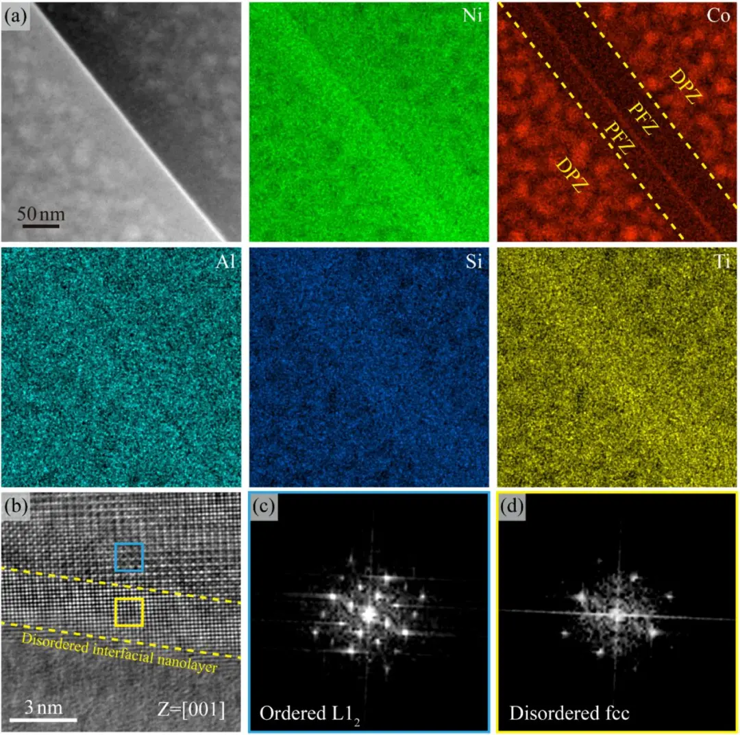 (b)-(d)STEM-HRTEM图像和相应的FFT图像,显示了在相邻L12晶粒之间的晶界处均匀装饰的无序纳米层。