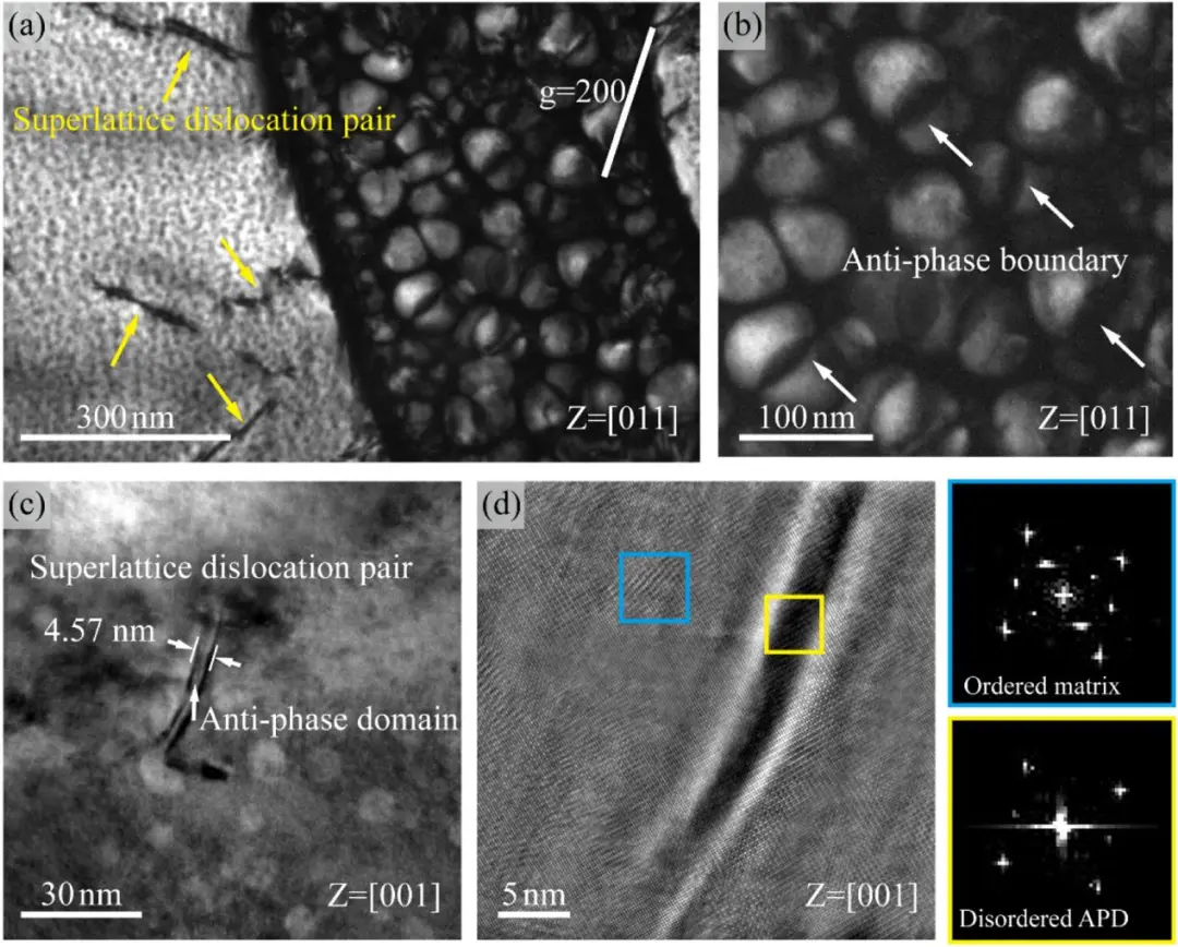 (d)APD的HRTEM图像,显示超晶格位错对之间的无序区。它们的FFT模式显示在右侧。