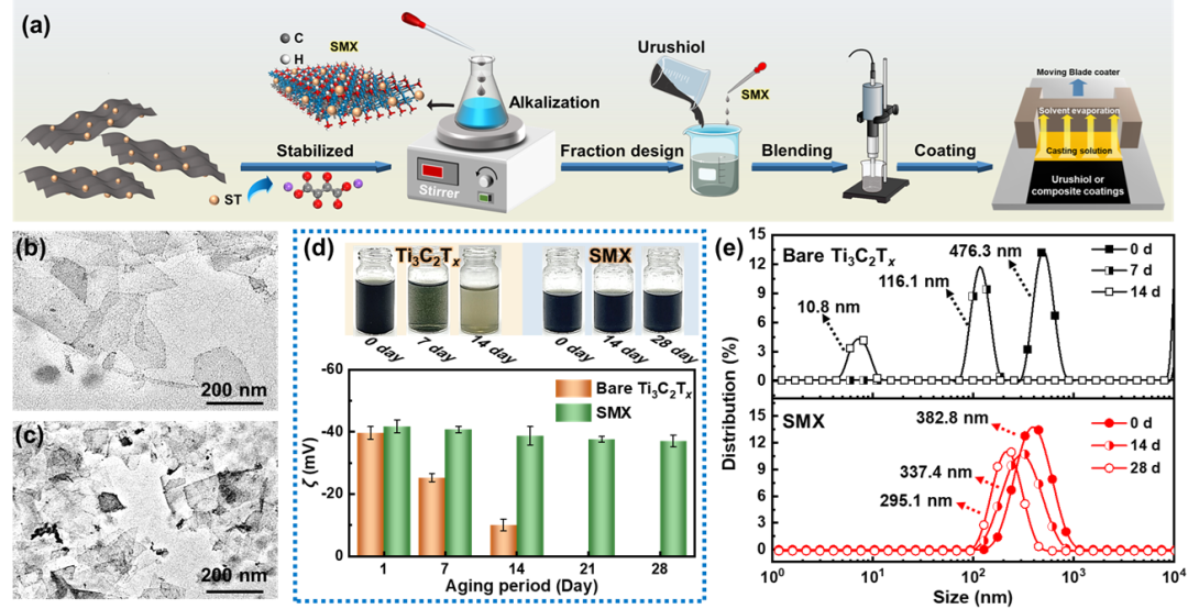 图1. (a) SMX纳米片的制备与涂层构建流程示意图;(b, c) 新鲜蚀刻和碱化SMX的透射电子显微镜(TEM)图像;(d) Ti3C2Tx和SMX胶体分散液在不同时间下的颜色变化及其ζ电位变化图;(e) Ti3C2Tx和SMX在自然空气条件下的粒径分布演变图。