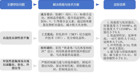 湖南钢铁集团技术研究院有限公司、湖南华菱湘潭钢铁有限公司以及湖南科技大学围绕“高强韧协同 ”与“优良焊接性能 ”两大核心问题,构建了成分—工艺—组织性能协同调控技术体系, 实现了 1 200 MPa 级高强水电用钢的关键性能突破(见图1)。