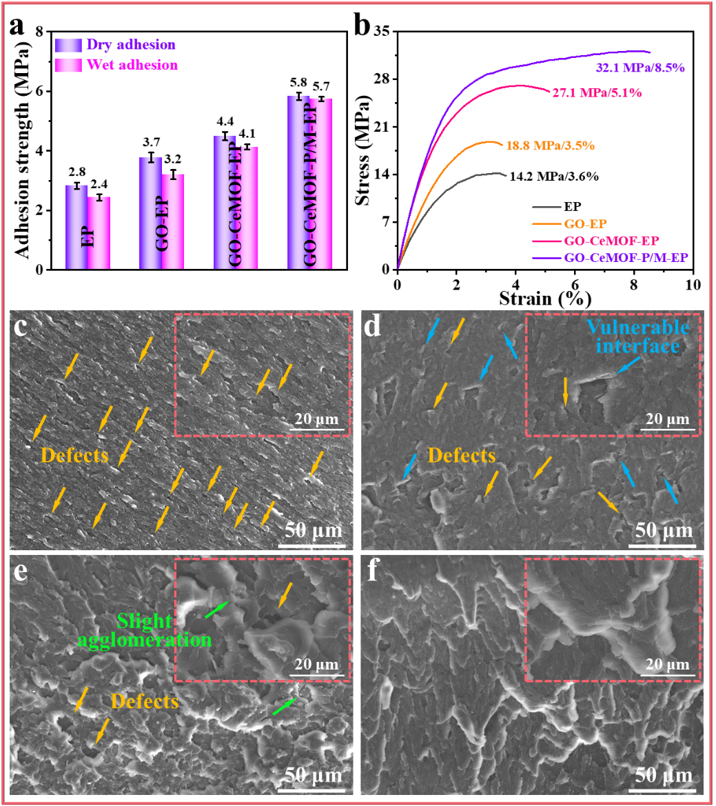 01 全文速览 本研究设计了一种氧化石墨烯/铈基金属有机框架多尺度结构并实现了双功能化负载(GO-CeMOF-P/M),以此为基础构筑海洋防护涂层。GO-CeMOF-P/M均匀分散与基体的协同作用显著提升了涂层的致密性和力学性能,同时具备环境响应与主动防护能力,使涂层具有优异的稳定性与智能防护效果。经80天模拟海水浸泡后,复合涂层低频阻抗模值达1.2×10¹⁰ Ω·cm²,较纯环氧涂层(7.3×10⁷ Ω·cm²)提升164.4倍,展现出可靠的长效防护性能。 02 研究背景 海洋资源的高效开发是国家海洋经济可持续发展的战略支柱,而海工装备与船舶在复杂环境下的长周期稳定服役则是实现这一目标的关键保障。据权威研究显示,我国每年因海洋腐蚀造成的直接经济损失超过万亿元,占GDP总量的1.1%。有机防护涂层是抑制金属电化学腐蚀最有效的手段。然而,在长期服役过程中,涂层内部逐步产生微孔与裂纹,导致其服役寿命下降。因此,突破传统涂层在缺陷耐受性与损伤容限方面的瓶颈,研发兼具长期阻隔性能与智能响应能力的新型防护涂层体系,已成为当前海洋材料防腐领域面临的重要科学挑战。 03 本文亮点 (1)构建了一种功能化多尺度纳米复合材料,用于制备兼具智能特性的长效防护涂层。 (2)复合涂层具有机械增强、自报告和主动防护功能,实现了多维度协同防腐性能提升。 (3)结合实验测试与第一性原理(DFT)计算,揭示了涂层多功能协同防护的微观作用机制。 04 图文解析 基于两步法制备GO-CeMOF-P/M复合纳米材料:首先利用有机配体在氧化石墨烯纳米片表面进行锚定吸附;随后引入Ce⁴⁺离子,通过金属-配体配位作用实现CeMOF在GO表面上的原位可控生长;最终在真空环境下将5-氨基-1,10-菲咯啉(P,自报告剂)和2-巯基苯并咪唑(M,缓蚀剂)双重功能分子负载至CeMOF孔道,从而获得GO-CeMOF-P/M复合材料。CeMOF晶体作为"结构铆钉"有效抑制了GO的团聚。 图1(a)GO-CeMOF-P/M复合材料制备示意图。(b)GO,(c)GO-CeMOF,(d)GO-CeMOF-P/M的SEM图像。(e)GO-CeMOF-P/M的元素分布图。 由于界面强化、交联密度提升,以及复合材料中含氧/氮官能团与钢基体间的配位协同效应,导致GO-CeMOF-P/M-EP涂层的结合力显著提高。此外,复合涂层的抗拉强度和延展性得到了同步改善,其增强机制可从三方面阐释:(1)均匀分散的GO-CeMOF-P/M作为"桥梁"强化层间/层内氢键,实现高效应力传递;(2)P/M分子的氨基/杂原子与CeMOF的丰富羰基共同构建氢键网络;(3)GO-CeMOF-P/M部分替代多胺固化剂参与环氧链交联反应。 图2(a)不同涂层的附着力和(b)应力应变曲线。(c)EP、(d)GO-EP、(e)GO-CeMOF-EP和(f)GO-CeMOF-P/M-EP涂层拉伸后的断裂形貌。 基于扫描振动电极技术(SVET)对 GO-CeMOF-P/M-EP涂层的主动防护性能进行量化评估。结果显示,GO-CeMOF-P/M-EP涂层的电流密度峰值在浸泡过程中下降且无扩散现象,表明其具备持续可靠的主动防护能力。SEM/EDS与Raman分析表明,该性能源于复合材料中P和M分子在环境刺激下的可控释放,这些分子在钢基体表面吸附形成致密保护膜,有效阻隔腐蚀介质。DFT计算进一步从电子尺度揭示机制:P/M分子中N、S杂原子的2p轨道与Fe(110)晶面的3d轨道发生轨道杂化,引发显著的电荷转移,从而强化了分子与金属界面的化学吸附作用。这种原子尺度的界面相互作用机制,最终阐释了GO-CeMOF-P/M-EP涂层卓越主动防护性能的微观驱动力。 图3引入划痕后(a)EP和(b)GO-CeMOF-P/M-EP涂层浸泡24小时的SVET电流密度图。剥离(c)EP和(d)GO-CeMOF-P/M-EP涂层后,划痕附近区域的腐蚀形貌。(e) EP和GO-CeMOF-P/M-EP涂层划痕附近的拉曼光谱。(f1-f4)M和(g1-g4)P分子的几何优化构型和吸附在Fe(110)晶面上的EDD和PDOS。 水溶液显色反应评估表明,GO-CeMOF-P/M纳米复合材料与Fe²⁺存在特异性比色响应:初始淡黄色上清液加入0.5 mL Fe²⁺溶液(10⁻⁵ M)后迅速转变为浅粉色,且显色强度随Fe²⁺浓度增加呈梯度增强。划伤的GO-CeMOF-P/M-EP涂层在30分钟内即出现亮红色信号,该现象归因于P分子与Fe²⁺的快速络合显色。这种早期可视化机制源于阳极溶解产生的Fe²⁺与P分子的强配位作用,使纳米复合材料可作为探针精准追踪腐蚀起始位点,为维护修复提供关键预警指标,从而在严重损坏之前及时进行维护和修复。 图4(a)加入0.5 mL不同浓度的Fe²⁺溶液后,2 mg/mL GO-CeMOF-P/M水溶液的颜色变化。(b)纯EP(灰色)和GO-CeMOF-P/M-EP(红色)涂层损伤后24小时内中性盐雾试验的光学图像。(c) GO-CeMOF-P/M-EP涂层的自报告机理。 在模拟海水溶液中浸泡80天后,GO-CeMOF-P/M-EP涂层的Zf=0.01 Hz值为1.21×1010 Ω·cm2,较EP涂层(7.38×107 Ω·cm2)高出164.4倍。此外,GO-CeMOF-P/M-EP涂层保护下的金属基体表面未检测到腐蚀产物或氯、氧等元素渗透,进一步了佐证涂层有效阻断了金属/腐蚀介质的电化学相互作用。 图5不同涂层在3.5 wt.% NaCl溶液中浸泡80 d的(a)logZf=0.01 Hz,(b)logfb,(c)logCc和(d)logRct。剥离(e)EP、(f)GO-EP、(g)GO-CeMOF-EP和(h)GO-CeMOF-P/M-EP涂层后钢表面形貌和元素分布。 05 总结与展望 本研究巧妙设计了一种功能化多尺度纳米复合材料,成功制备出兼具机械增强、自报告与主动防护功能的智能环氧涂层(GO-CeMOF-P/M-EP)。GO-CeMOF-P/M在环氧涂层中的均匀分散及其表面官能团与聚合物间的化学相互作用显著提升了涂层的交联密度与致密性。同时,GO-CeMOF-P/M实现了智能响应释放有机/无机缓蚀剂,从而赋予缺陷区卓越的主动防护性能。此外,依托Fe²⁺与P分子的特异性显色反应可实现涂层缺陷可视化自