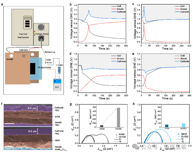 氢气燃料电池作为一种清洁高效的能源转换技术,其耐久性和成本是规模化应用的主要瓶颈。其中,启停(SU/SD)过程中的反向电流衰减(RCD)现象导致的阴极腐蚀是影响耐久性的关键问题。在启停过程中,阳极会形成氢气和空气共存区域,引发寄生氧还原反应(ORR),产生超过1.5 V的界面电位差,导致阴极碳载体和催化剂严重氧化降解(图1)。传统解决方案依赖复杂系统(如惰性气体吹扫)或昂贵的抗腐蚀材料,增加了成本和系统复杂性。 近日,中国科学技术大学高敏锐教授与唐凯斌教授团队合作,报道了一种铜掺杂改性的钼镍基合金催化剂(MoNi3.6Cu0.4),成功解决了阴离子交换膜燃料电池(AEMFC)启停过程中的阴极腐蚀难题。该催化剂在碱性介质中表现出优异的氢氧化反应(HOR)催化活性和对氧还原反应(ORR)的惰性。这种独特的双功能特性使其能够有效抑制启停阶段由寄生ORR引发的瞬时界面电位骤升,从而保护阴极。相关成果以“Copper-Tailored Molybdenum-Nickel Catalyst Boosts Hydrogen Oxidation and Suppresses Parasitic Oxygen Reduction for Durable Fuel Cells”为题6月25日发表在国际学术期刊《德国应用化学》上(Angew. Chem. Int. Ed.2025,e202508535)。 图1: AEMFC启停中RCD过程的示意图 研究团队通过微波加热和后续热处理成功制备了MoNi3.6Cu0.4催化剂,并将其用作AEMFC阳极催化剂的膜电极组件进行模拟启停循环测试。结果显示,相比传统的Pt/C阳极,使用该催化剂的电池在启停过程中阴极电位跃迁从1.4 V大幅降低至安全范围(图2)。经过10次启停循环后,阴极催化剂层厚度几乎保持不变,阴极电荷转移阻抗的增幅也远低于Pt/C,峰值功率密度保持率达61%,显著优于Pt/C(28%)和未掺杂钼镍合金(47%),阴极腐蚀现象近乎消失。 图2:启停过程单电池耐久性 该工作开发了一种高效的非贵金属阳极催化剂,通过对HOR和ORR反应的“选择性催化”,为解决燃料电池启停过程中的关键RCD问题提供了一种简便有效的方案,无需复杂的系统改造即可显著提升电池耐久性。 论文的通讯作者是合肥微尺度物质科学国家研究中心的高敏锐和唐凯斌教授。中国科大葛晓琳和徐铜文教授为该工作提供了MTCP-50阴离子交换膜。论文共同第一作者为中国科大博士研究生朱磊、特任副研究员张晓隆、博士研究生杨宇、李烨成和王业华。相关研究受到国家自然科学基金委杰出青年科学基金、国家重点研发计划等项目的资助。