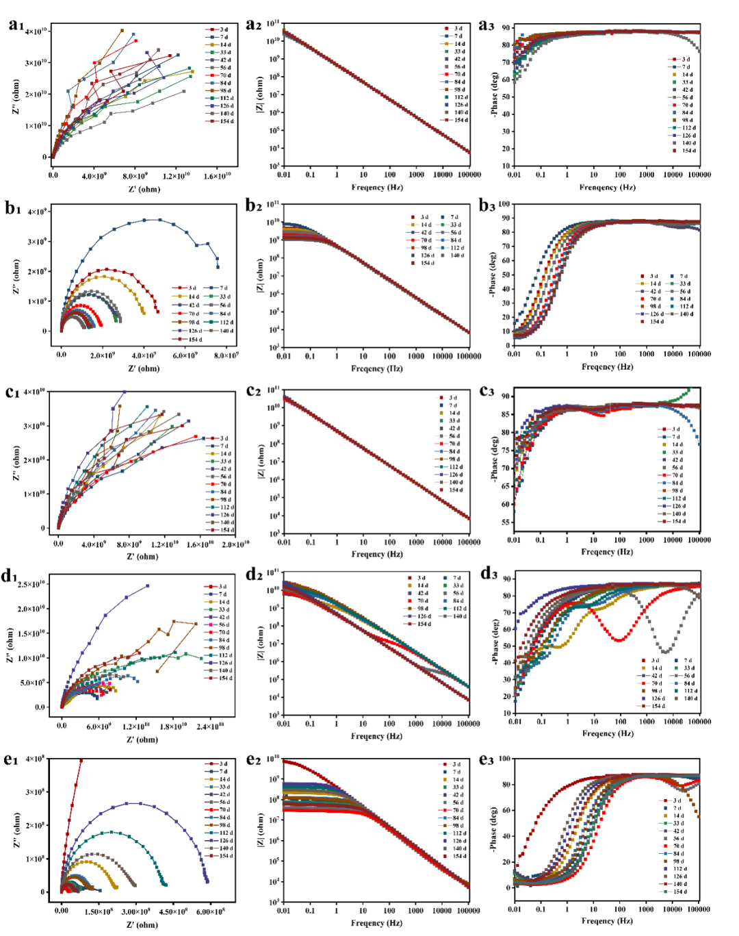 图4. 不同GO含量环氧复合涂层在3.5 wt% NaCl溶液中浸泡154天后的电化学阻抗谱图