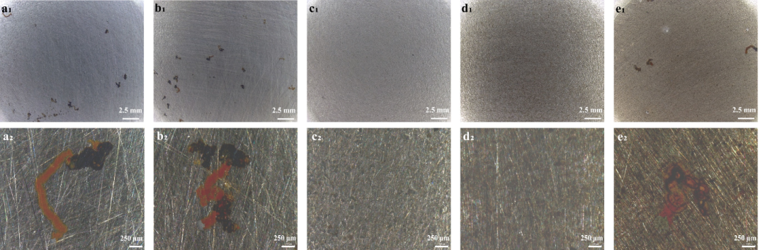 纯环氧涂层、0.05 wt% 和 0.50 wt% GO环氧复合涂层表面出现明显锈蚀(红褐色或黑色产物),存在点蚀倾向。而0.10 wt% 和 0.25 wt% GO环氧复合涂层表面完好,无明显腐蚀迹象,对基体提供了卓越的防护性能。