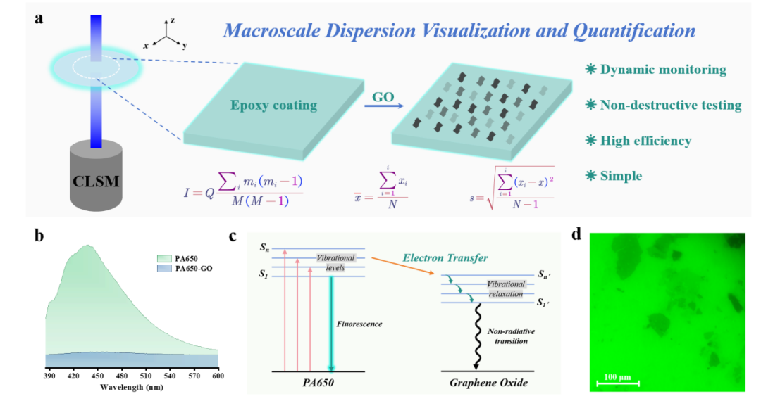 图1. GO在环氧涂层中宏观分散可视化与定量评估原理图及荧光猝灭现象。(a)利用GO对PA650固化环氧涂层本征荧光的猝灭效应,结合CLSM、Morisita指数和颗粒间距概率密度理论,实现GO宏观三维分散可视化和定量评估的原理示意图。(b) GO加入显著猝灭PA650/乙醇溶液的荧光发射。(c) PA650聚集分子与GO之间发生荧光猝灭的示意图。(d) CLSM荧光模式下,涂覆在载玻片上的GO被PA650固化环氧涂层覆盖后的荧光显微图像,GO表现为暗区,清晰展现其分散状态。