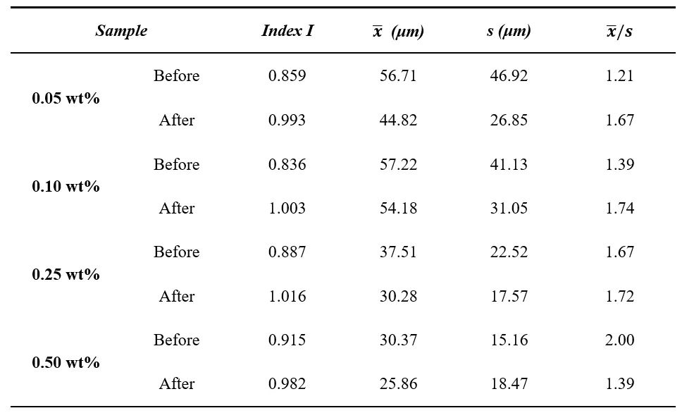 根据Morisita指数I分析,越接近1表示分布越接近理想随机分布。浸泡后,0.10 ~ 0.25 wt% GO样品的Morisita指数趋近于1(全局分布好),但需结合局部指标(