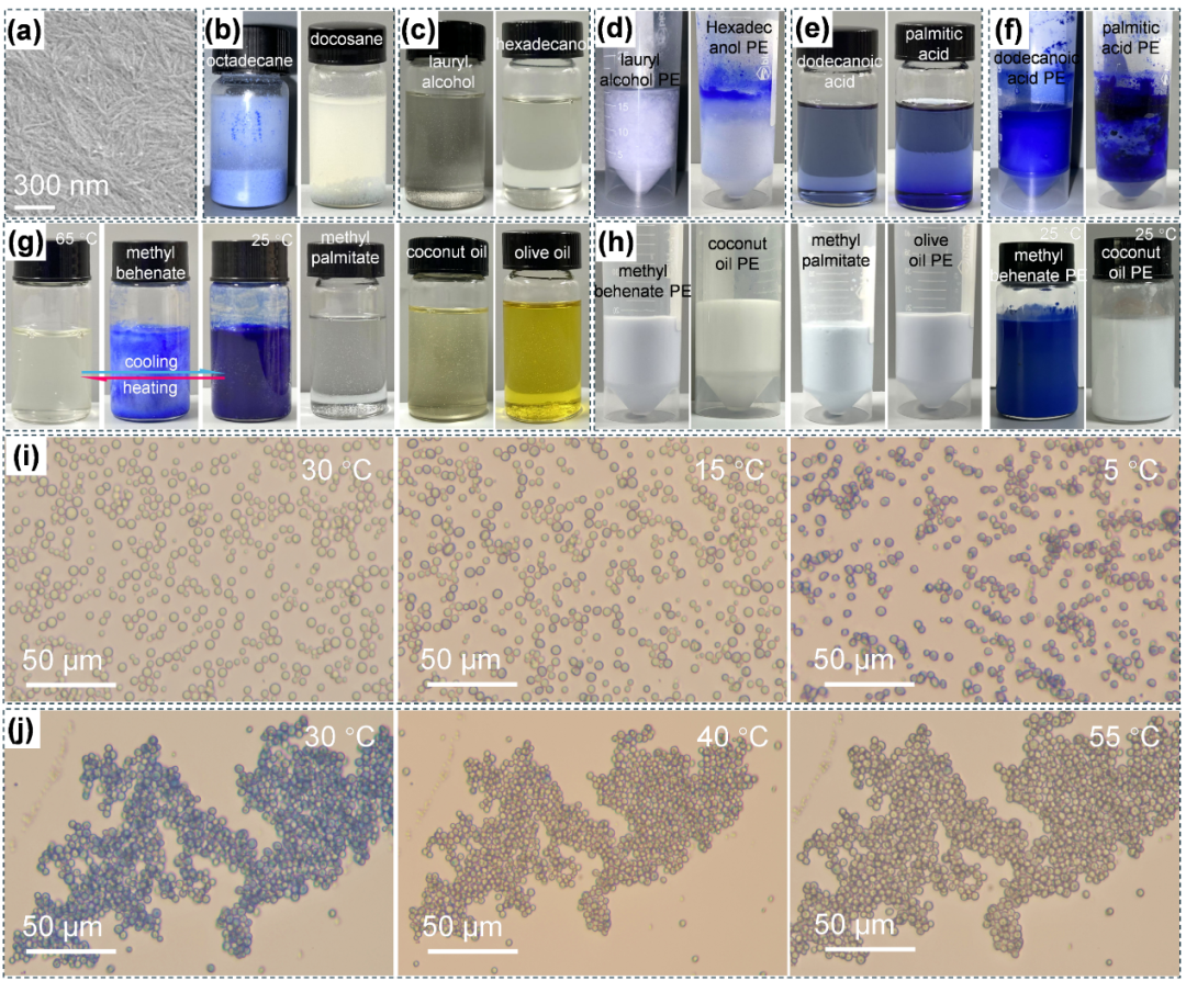 图 2.(a) CNC 的 SEM 图像。(b, c, e, g) 不同相变材料作为助溶剂中 CVL/BPA 的光学图像。(d、f、h)具有不同 CVL/BPA/PCM 作为油相的 PE 的光学图像。(i) TC-CO 和 (j) TC-MB PE 在不同温度下的光学显微镜图像。