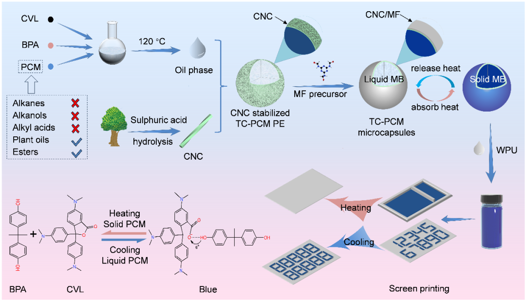 华南师范大学周国富教授团队张振课题组通过CNC稳定的Pickering乳液法制备了一种具有高潜热、可逆热致变色相变材料微胶囊,并应用于智能涂料。以 CNC 稳定的三组分TC 材料Pickering乳液为模板,通过原位聚合制备了以三组分TC材料为芯材、以 CNC/三聚氰胺甲醛树脂 (MF) 为壳层的TC-PCM 微胶囊。其中结晶紫内酯(CVL)、双酚A (BPA) 和PCM 的混合物为三组份 TC 材料和Pickering乳液的油相。二十二酸甲酯(山嵛酸甲酯,MB) 和椰子油 (CO) 因其优异的溶解CVL/BPA的能力 、被CNC 皮克林乳化的能力和适当的相变温度(PCT,MB 和 CO 的熔点分别为 55 °C 和 15 °C),而被选为PCM。所得的 TC-PCM 微胶囊表现出出色的防渗漏稳定性、热能储存和释放能力(TC-MB 为 200.2 J/g,PCM 含量为 89.0%)和快速的热致变色响应性。通过密度泛函理论分析了热致变色机制,TC-PCM 微胶囊PCT以下呈蓝色,在 PCT 上方变为白色。TC-PCM 微胶囊与水性聚氨酯结合得到了具有储热、可逆热至变色的智能涂料,可涂覆各种材料的表面。