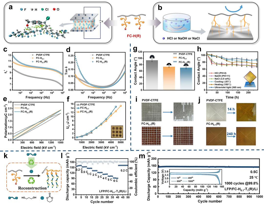 2025年7月4日,该研究以“Closed-Loop and Selective Recyclable Fluoro-containing Graft Copolymers with Diverse Applications”为题发表在《Advanced Materials》期刊,天津大学化学系博士生王玮榕为第一作者,北京化工大学曹鹏飞教授、李崚湾副教授与天津大学陈宇教授为共同通讯作者。北京化工大学田明教授、王腾教授,美国阿克伦大学(University of Akron)王军鹏教授等共同参与了研究工作。 “选择性拆解-再生-重构”的闭环回收策略 Scheme 1. PVDF-CTFE 接枝共聚物的闭环回收与应用示意图 【FC-H-T 接枝共聚物的合成】 FC-H-T接枝共聚物的合成主要分为两步:首先,利用原子转移自由基聚合(ATRP)技术,将4-乙烯基苯基甲醇(VBOH)修饰到主链PVDF-CTFE上,得到改性聚合物 FC-H (Scheme 1);然后,通过开环聚合将三亚甲基碳酸酯(TMC)单体接枝到FC-H,制得FC-H-T接枝共聚物。得到的FC-H-T各链段之间相容性、热稳定性、链段运动能力优于共混物FC/H/T。 图1. FC-H-T合成表征结果 【FC-H-T的电化学性能评估】 FC-H-T聚合物电解质在25 ℃时离子电导率为 6.3×10⁻⁴ S/cm,Li⁺迁移数为 0.8 (图2b),电化学稳定窗口达到4.4 V,与锂金属兼容性良好。在Li/Li对称电池中,0.5 mA/cm² 电流密度下可稳定循环超1000小时;LFP全电池0.5C循环1000次容量保持率 98.8%(图2d),NCM811高压电池340次循环后容量保持率80.3%(图2f),展现出优异的电化学性能。 图2. FC-H-T的电化学性能图 【FC-H-T的闭环回收】 图3. FC-H-T闭环选择性回收流程 【降解机理研究】 图4. 甲醇解对 FC-H-T 降解机制的研究 【回收聚合物的应用】 回收后的FC−H(R)聚合物可应用于静电电容器的电介质材料(图5a)以及防污涂层(图5b).D-E回线显示FC-H的放电能量密度显著高于初始PVDF-CTFE(0.45 vs. 0.17μC/cm2),这主要是由于PVBOH的-OH会与主链F形成氢键,诱导FC−H骨架β相增加及铁电畴尺寸减小(图5c-f)。OH单元赋予了FC-H功能性,回收膜展现出了对酸、碱、盐、紫外、高低温等恶劣环境的抗性(图5g-j)。此外,重构的FC-H-T(R)表现出了与初始FC-H-T相似的电化学性能。 图5. 闭环回收过程中各阶段产物的高价值应用研究