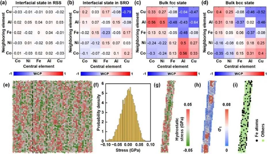 图3.(a) RSS 和(b) SRO 界面平面的不同元素对的 Warren-Coley 参数(WCP)。(C-D)用于比较的体单晶 fcc 和 bcc 相的 WCP。(e) SRO 界面,原子根据静水应力着色。(f)(e)中 SRO 界面的原子静水应力的统计分布。(g)界面位错区附近的原子视图,如(e)中的虚线框所示。(h)与(g)相同的位点,原子根据原子参数σ着色1按 NTA 方法计算。(i)与(g)相同的位置,Fe 原子与其他原子的区别在于黑色。