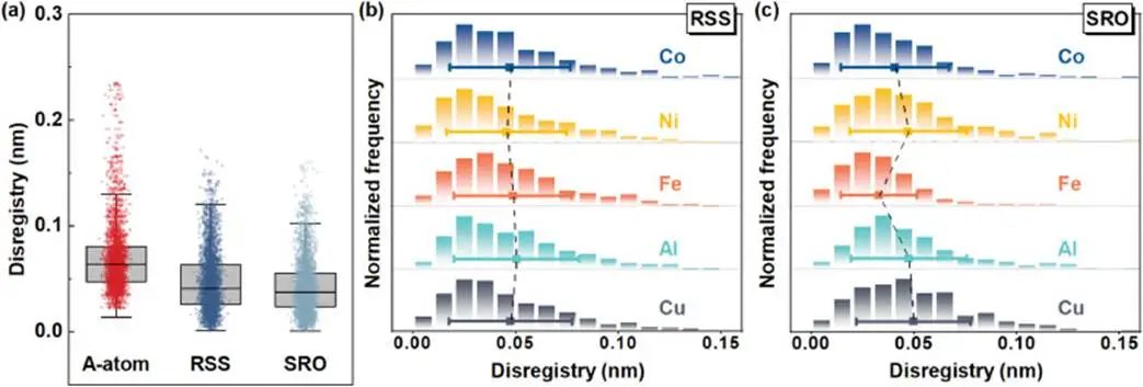 图7.(a) A-atom、RSS 和 SRO 样本的 disregistry 向量值的箱形图。(二、三)RSS 和 SRO 样本中 disregistry 向量值分布的元素依赖性。