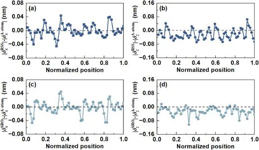 图6.(a, b) RSS 和(c, d) SRO 接口的 disregistry 向量的 x 分量和 z 分量与 A-atom 接口的差异。