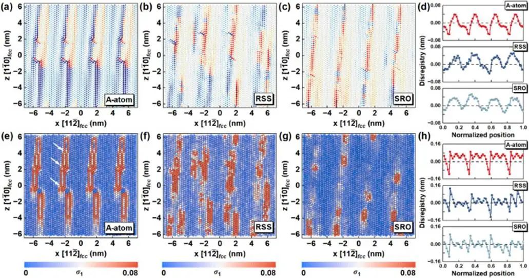 图5.松弛的(a) A-atom、(b) RSS 和(c) SRO 接口的 disregistry 向量图。箭头的长度表示向量的大小,颜色是根据向量的 x 分量的符号分配的。disregistry 向量以放大倍数 2 显示,以获得更好的可视化效果。(e) A-atom、(f) RSS 和(g) SRO 界面的原子结构。原子根据原子参数σ进行着色1通过 Nye 张量分析(NTA)方法计算。(e)中的箭头指出了 A 原子样品中代表性原子步骤的位置。沿 x 方向 z = 0 处 disregistry 向量的 x 分量和 z 分量分别显示在(d)和(h)中。