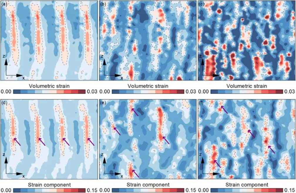 图9.原子体积应变分布及其应变分量这xx对于(a, d) A-atom、(b, e) RSS 和(c, f) SRO 样本中的接口。紫色箭头表示界面处的位错成核位点。