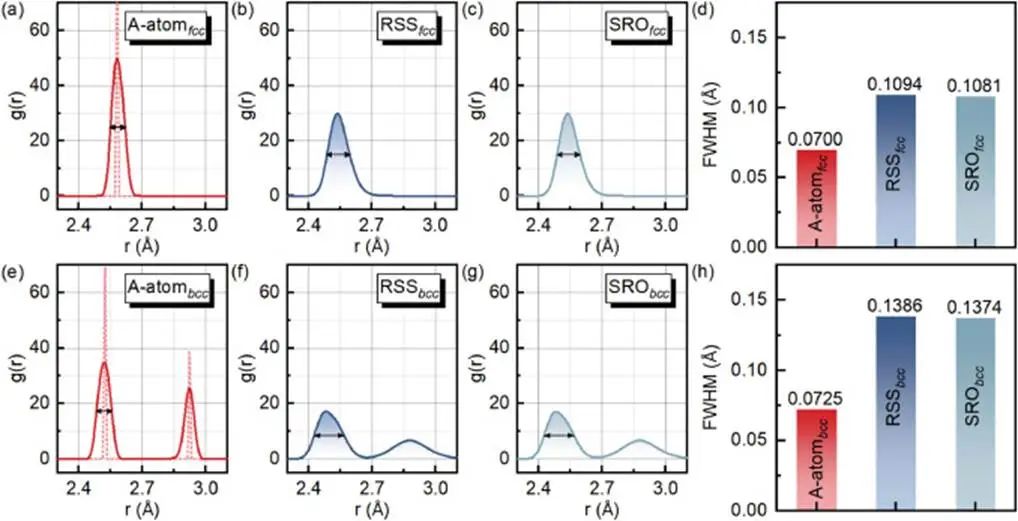 图4.样本的径向分布函数 g(r)。(一、五)A-atom、(b, f) RSS 和(c, g) SRO。(d, h)样品的半峰全宽(FWHM) g(r)。(a, e)中的虚线表示未松弛的A 原子样品的 g(r)。