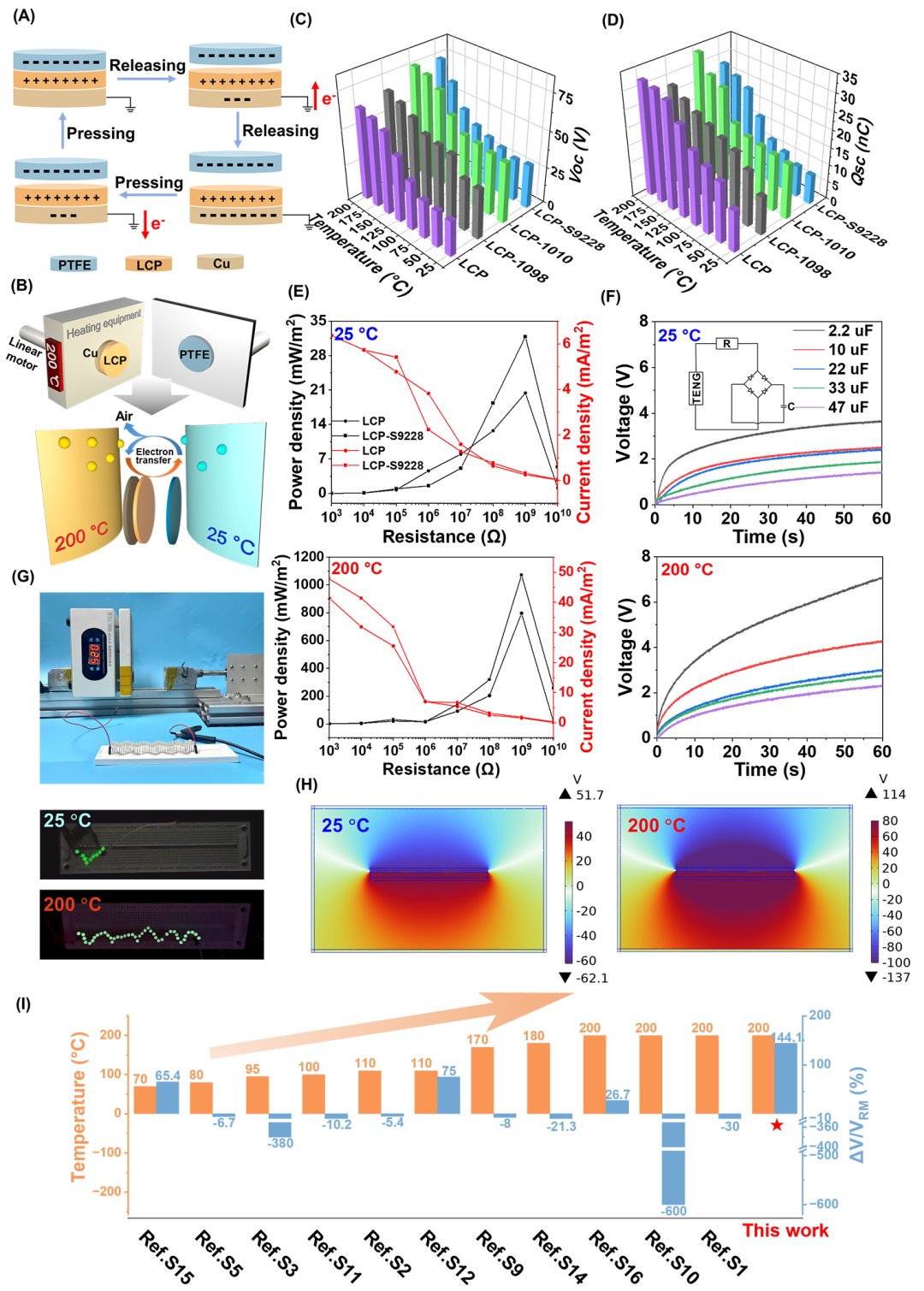 针对这一挑战,东华大学材料学院游正伟教授、管清宝教授团队合成了一种高温增强型摩擦电材料——液晶聚芳酯(Liquid crystalline polyarylate, LCP)。该材料通过一步熔融缩聚法制备,其高刚性芳环主链结构赋予摩擦纳米发电机(TENG)优异的热稳定性(图1),展现出LCP作为高温摩擦电材料的潜力。此外,该工作通过引入抗氧化剂清除链式反应中的自由基并促进过氧化物分解,提升了LCP的热氧稳定性。基于抗氧化LCP的高温增强型TENG(HTE-TENG)在200 °C时的峰值电压较25°C提升了144.1%,其峰值输出功率密度在109 Ω负载时为1071.3 mW·m−2(图2),表明高温对电输出性能具有显著的增强效果。HTE-TENG的高温增强特性与LCP的介电性能(图3A、3B)有关,LCP在100 °C以上介电性能的突变对应DMA曲线的β转变(聚合物无定形区域中受限链段的局部运动)。当温度达到β转变温度附近,链段运动的激活显著增强了偶极子的取向极化能力,导致更高的介电常数,因此提高了摩擦电输出性能;此外,LCP粗糙表面的不规则性增加了摩擦电相对接触表面积(图3C、3D),进一步提高HTE-TENG的电输出性能。这项工作为能源装置和电子设备提供了一条可持续的路线,拓展了TENG在救援工作、个人防护和极端环境中的潜在应用。