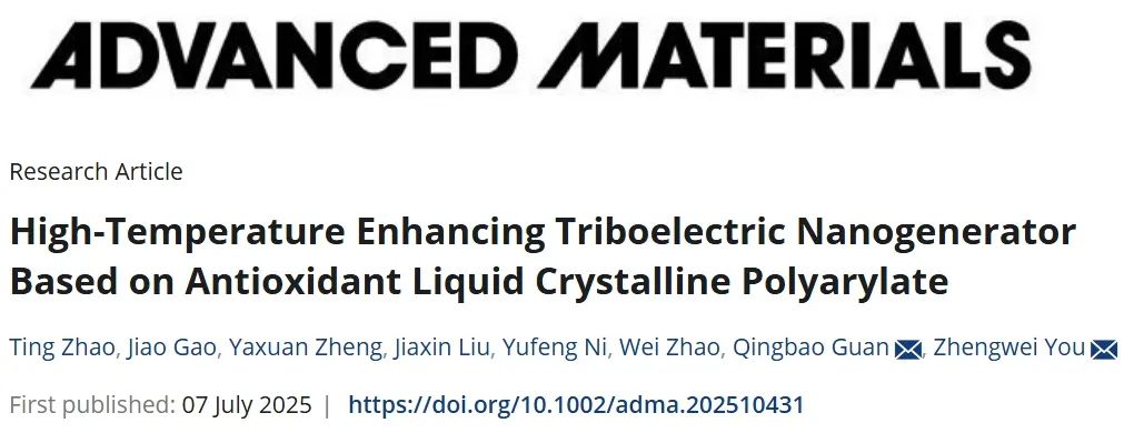 2025年7月7日,该工作以“High-Temperature Enhancing Triboelectric Nanogenerator Based on Antioxidant Liquid Crystalline Polyarylate”为题发表在《Advanced Materials》上(Adv. Mater. 2025, 2510431)。该研究得到国家重点研发计划项目、国家自然科学基金面上项目以及东华大学2025年学科创新领域培育项目的支持。