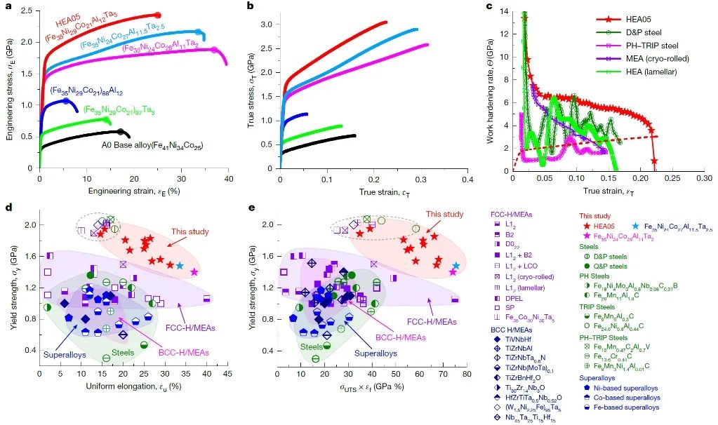 图4. (a-b)不同成分的复杂合金的工程应力-应变和真应力-应变曲线,(c) Fe35Ni29Co21Al12Ta3复杂合金的加工硬化性能与其他2GPa级超高强金属材料(D&P钢、马氏体钢、中高熵合金)对比,(d,e) Fe35Ni29Co21Al12Ta3复杂合金的屈服强度-均匀拉伸延伸率匹配和屈服强度-强塑积匹配与其他金属材料对比,室温力学性能组合明显超越目前报道的其他金属材料。