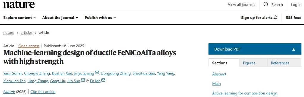 该研究成果以“Machine-learning design of ductile FeNiCoAlTa alloys with high strength”(“机器学习设计具有高强度塑性的合金”)为题在线发表于《Nature》(《自然》)。西安交通大学材料学院博士生Yasir Sohail、张崇乐分别为该论文的第一、第二作者,张金钰教授、马恩教授和孙军院士为论文共同通讯作者,参与该工作的还包括刘刚教授、薛德祯教授、杨洋副教授和博士生张东东、高少华、范晓轩和张航。西安交通大学金属材料强度全国重点实验室是该工作的唯一通讯单位和完成单位。该工作是西安交通大学材料学院外籍留学生首次以第一作者发表《Nature》文章。该工作得到了国家自然科学基金、111引智基地、陕西省科技创新团队项目、中央高校基本科研业务费等项目资助。表征及测试工作得到西安交通大学分析测试共享中心、材料学院实验技术中心和上海光源的大力支持。