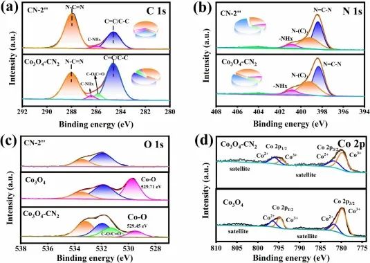 Fig. 3The XPS spectra of CN-2″ and Co3O4-CN2: (a) C 1 s spectra, (b) N 1 s spectra, (c) O 1 s spectra and (d) Co 2p spectra.