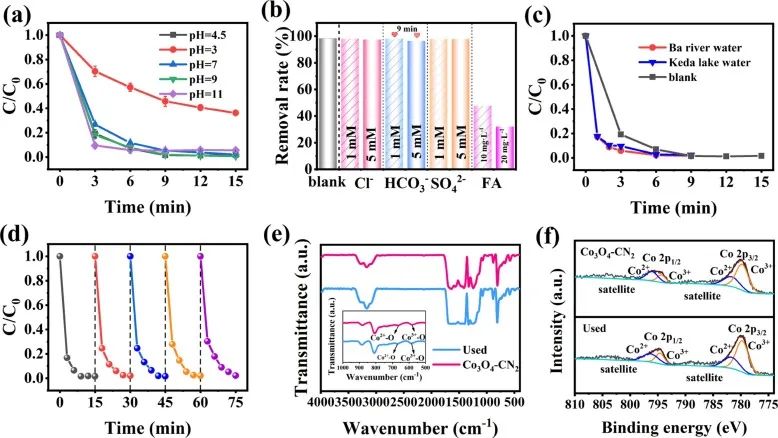 Fig. 5(a) pH value, (b) inorganic anions, (c) different water on OTC degradation in the Co3O4-CN2 + PMS system, (d) the removal efficient of five cycle, [Experiment conditions: catalyst = 20 mg·L−1, PMS = 0.15 mM, OTC = 20 mg·L−1, temperature = 30 °C] (e) FTIR and (f) Co 2p of Co3O4-CN2 and used material.