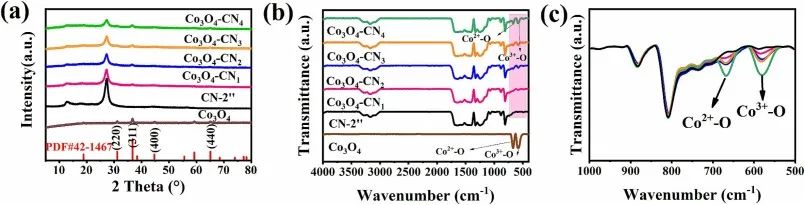 本研究通过溶剂挥发与煅烧相结合的方法,以乙酰丙酮钴(II)为钴源,制备了Co₃O₄-CN_x复合材料。通过煅烧方法,实现了碳掺杂与Co₃O₄纳米颗粒的原位生成。钴和碳组分的引入导致材料表面电荷重新分布,构建了新型导电通道,并降低了界面电荷转移电阻,显著提升了电子转移效率,使Co₃O4-CN₂在通过活化过氧单硫酸盐(PMS)降解有机污染物时展现出优异的催化性能。Co₃O₄-CN₂ + PMS系统在15分钟内实现了99.5%的四环素降解率,动力学常数为0.466 min^(−1)。机理分析表明,反应过程涉及单线态氧、高价钴-氧物种以及电子转移介导的非自由基途径。Co₃O₄-CN₂ + PMS系统在广泛的pH范围(4.5–11.0)及存在多种无机阴离子条件下均展现出卓越的降解效率。此外,Keda湖水样和Ba河水样中OTC的降解速率常数分别为0.947 min−1和1.074 min−1,表明该系统具有优异的环境适应性。循环实验进一步证实了该系统保持稳定的降解效率,凸显其在有机废水处理中的实际应用潜力。