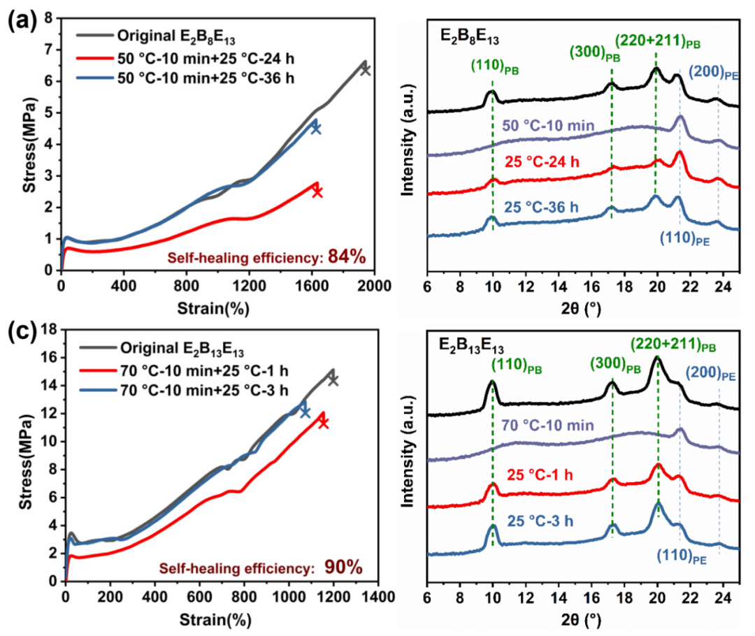 这种独特的三相协同机制在分子层面解决了自修复效率与力学性能的矛盾。在室温下,PB晶体与PE晶体协同结晶,赋予材料高达15 MPa的拉伸强度;当温度升至50℃以上,PB晶体熔融转化为无定形态,链段运动能力显著增强,协同原有无定型相在温和加热条件下实现快速自修复(效率达90%),同时PE晶体网络维持整体结构稳定性。