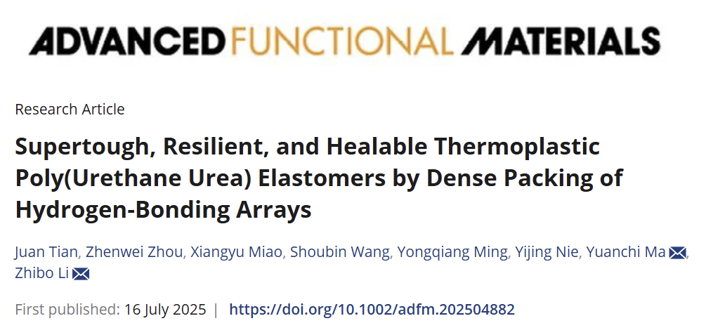 青岛科技大学李志波教授、马远驰特聘副教授团队设计了一类基于聚己内酯(PCL)的新型TPU弹性体,通过引入酰基氨基脲(ASCZ)基团形成密集氢键阵列。该材料展现出70 MPa的极限强度、1100%的断裂伸长率及260 MJ m⁻³的韧性,同时彻底抑制PCL结晶,实现1000%应变下的稳定回弹性。通过调节扩链剂化学结构,还可精准控制材料工作温度与自修复速率。